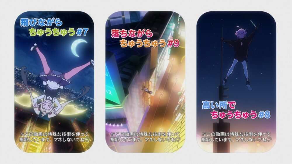 Mayonaka Punch wplata również ujęcia rodem z mediów internetowych. Widok z perspektywy kamery vlogowej czy okien czatu na żywo pojawiających się na ekranie występują dość często. Animacja jest płynna i dynamiczna, szczególnie w scenach humorystycznych oraz tych ukazujących wygłupy bohaterek przed kamerą.